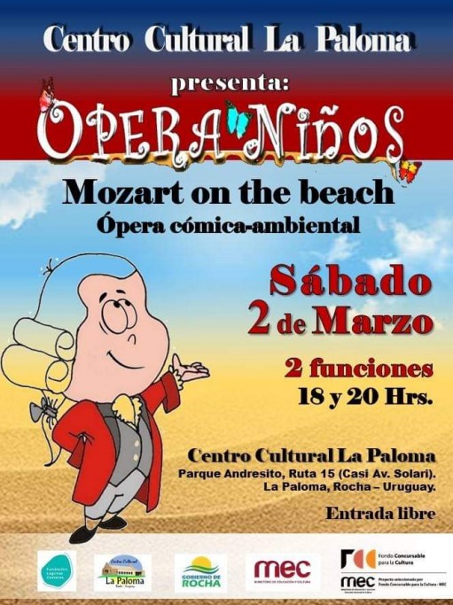"Mozart on the beach" es una opera cómica ambiental para niños que se presentará en el Centro Cultural de La Paloma este sábado 2 de marzo a partir de las 18 hs.
