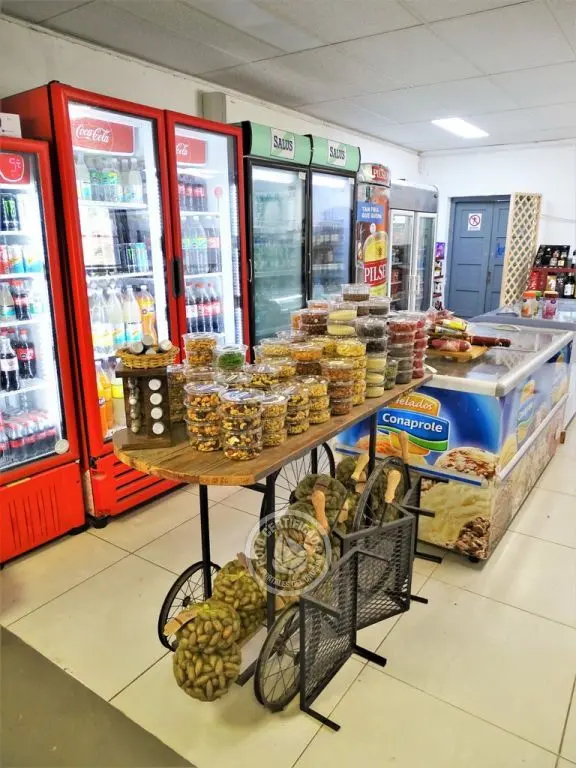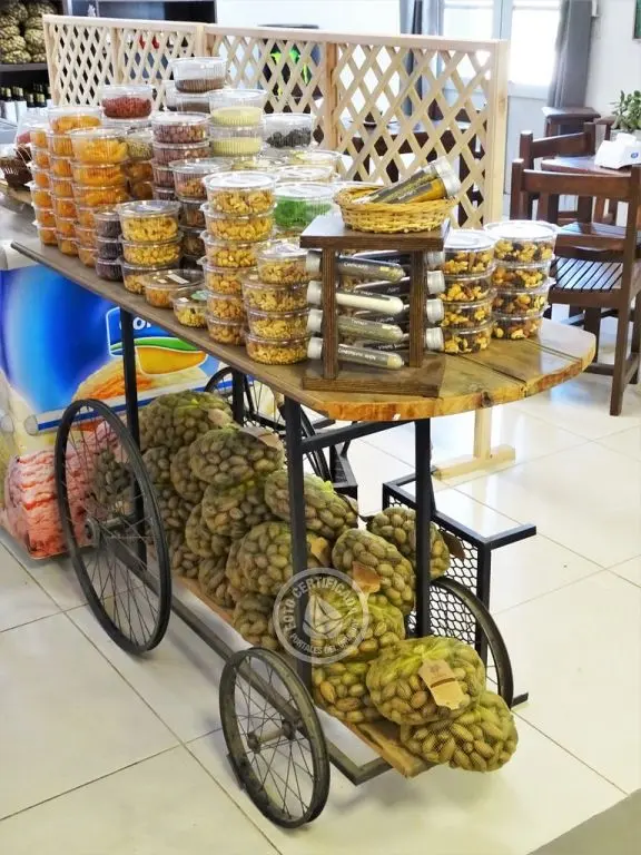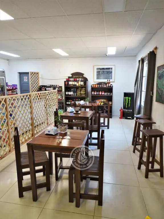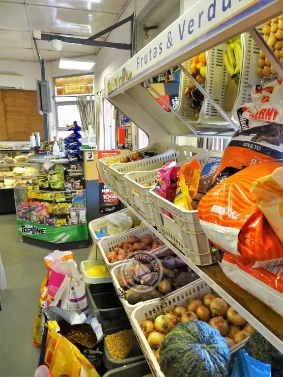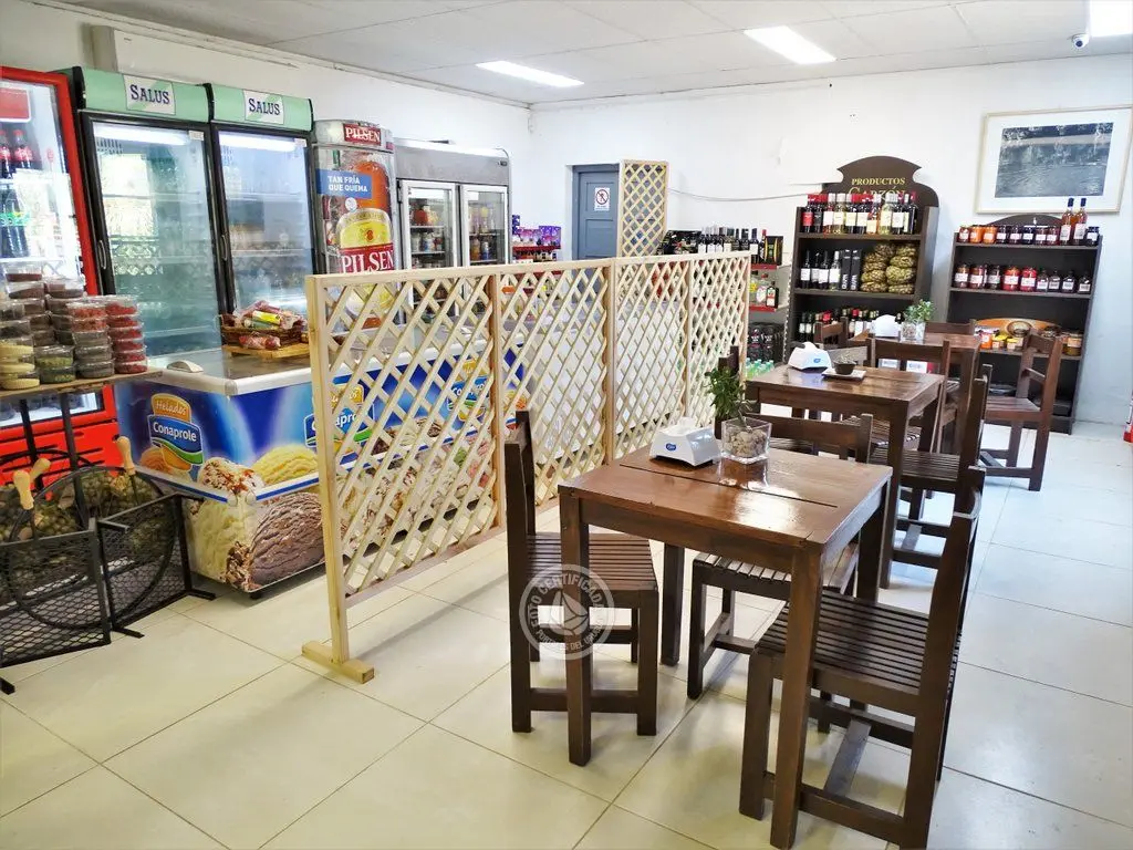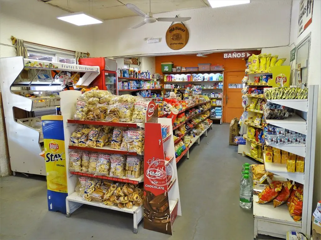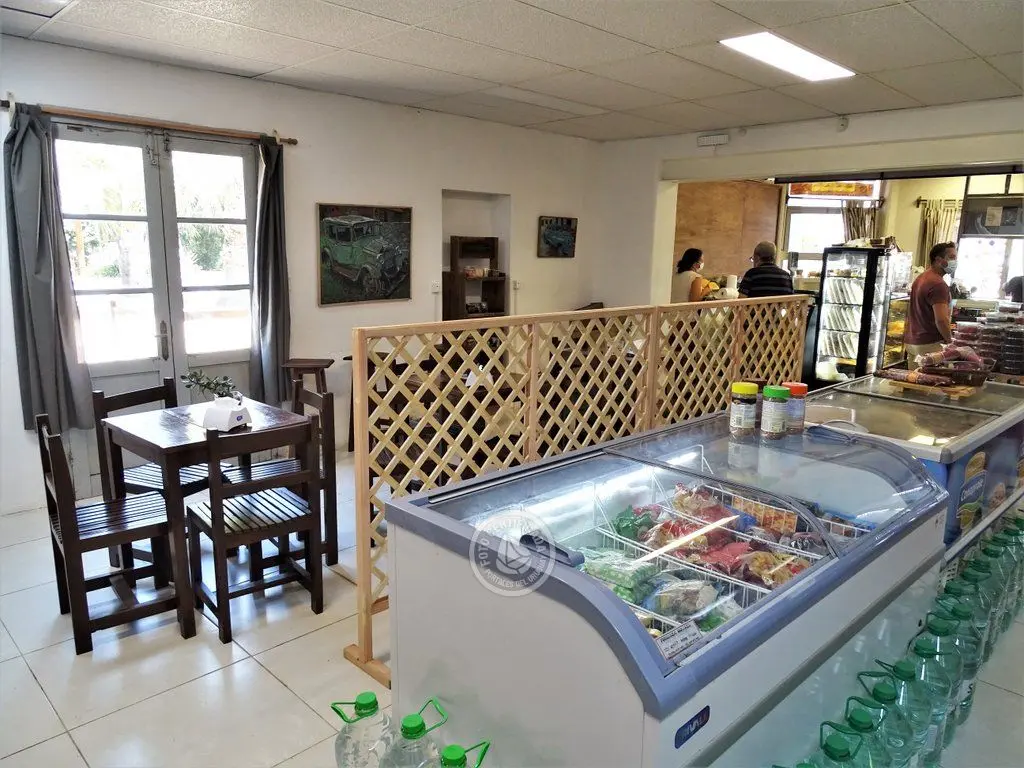 Mercaderías locales artesanales, frutos deshidratados, semillas, comestibles, bebidas, vinos, estación de servicio, baños.