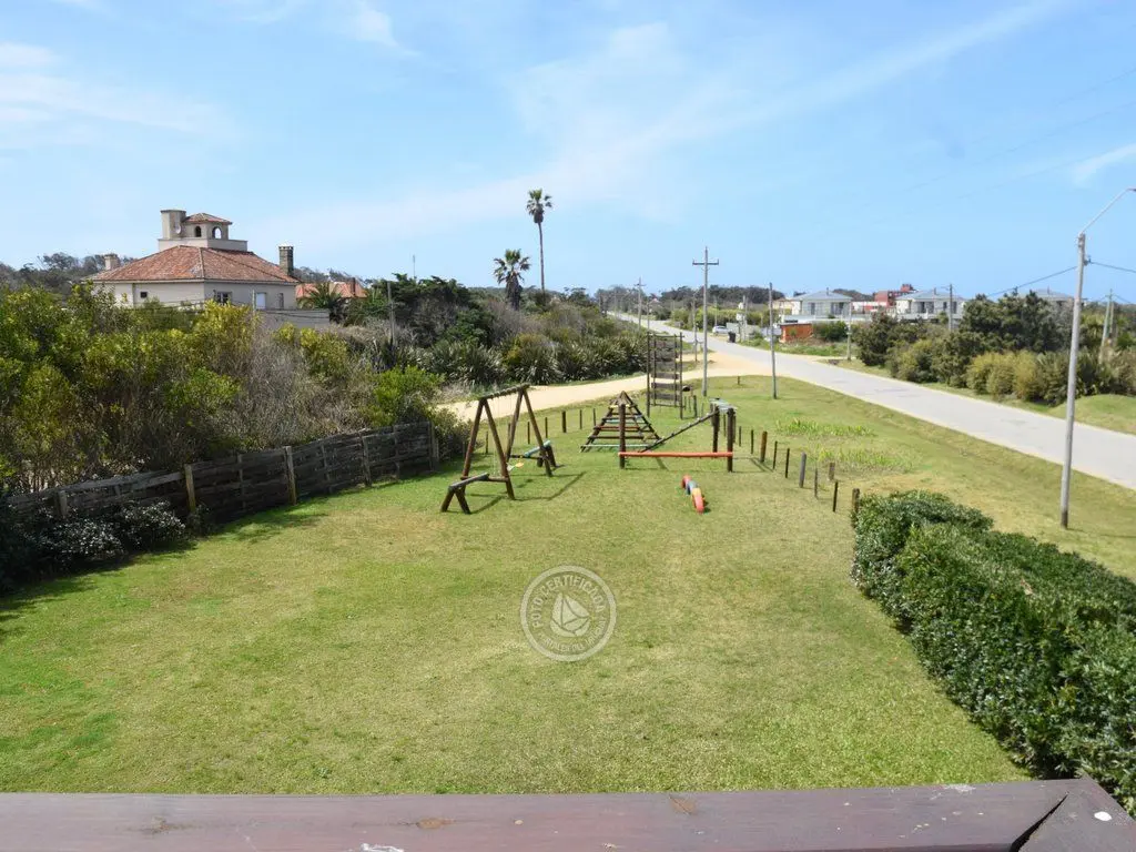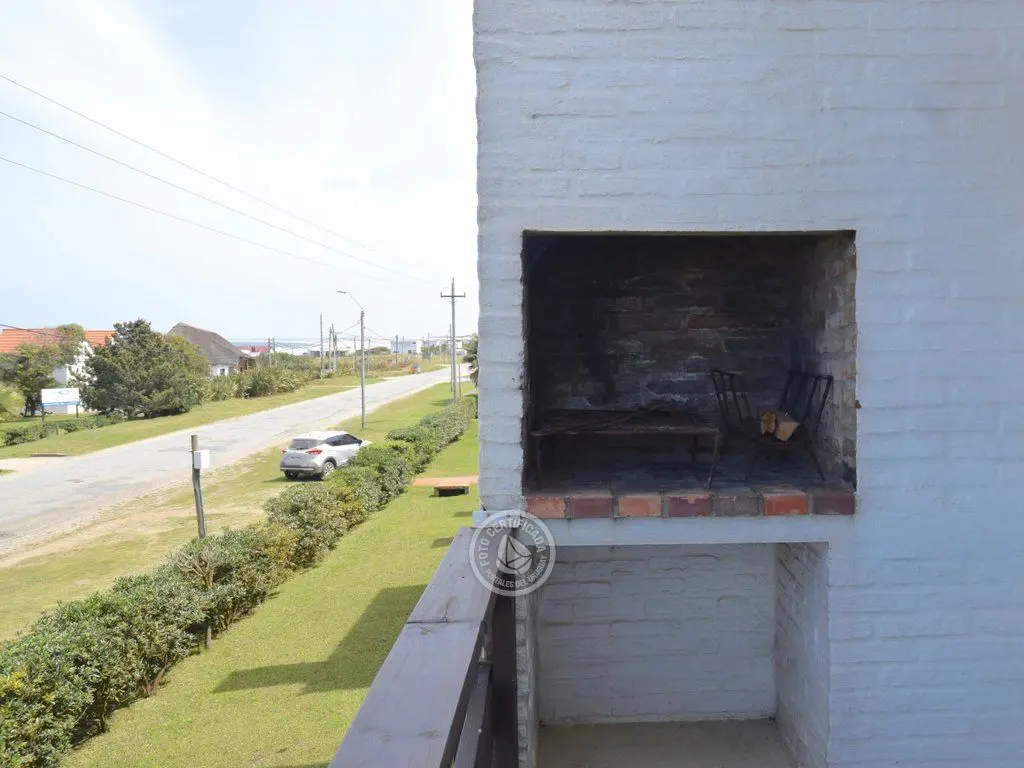 Varanda frontal com churrasqueira, cadeiras e mesa, vista para o mar excepcionais e entardeceres fantásticos.